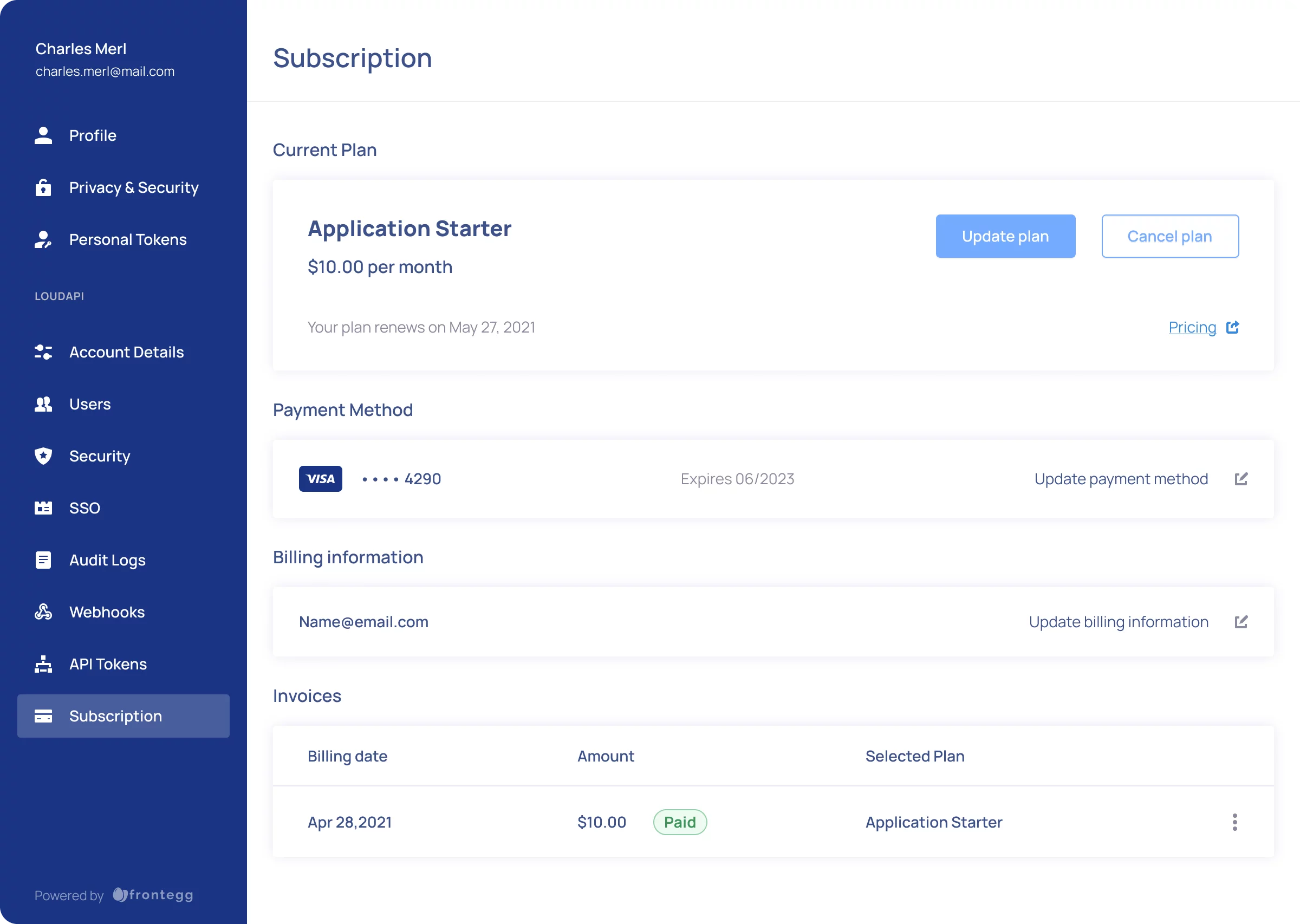 Set your pricing with Frontegg. Enable customers to chose and switch plans, get automated renewals, and more.