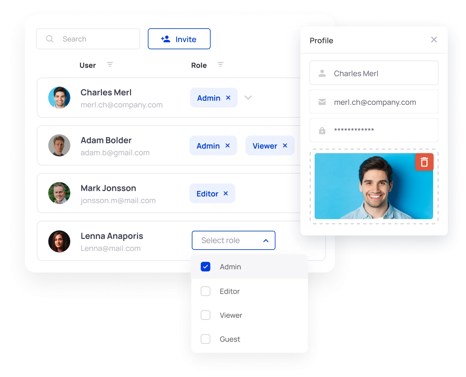 Let users manage teams by inviting team members, defining and assigning roles and permissions, creating user profiles, and more.